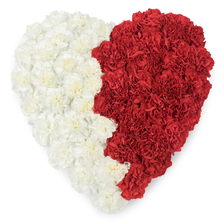 Embrace tradition with our classic red and white carnation heart bouquet. This timeless arrangement features a balanced mix of red and white carnations, artfully arranged in a heart shape to convey enduring love and sympathy.